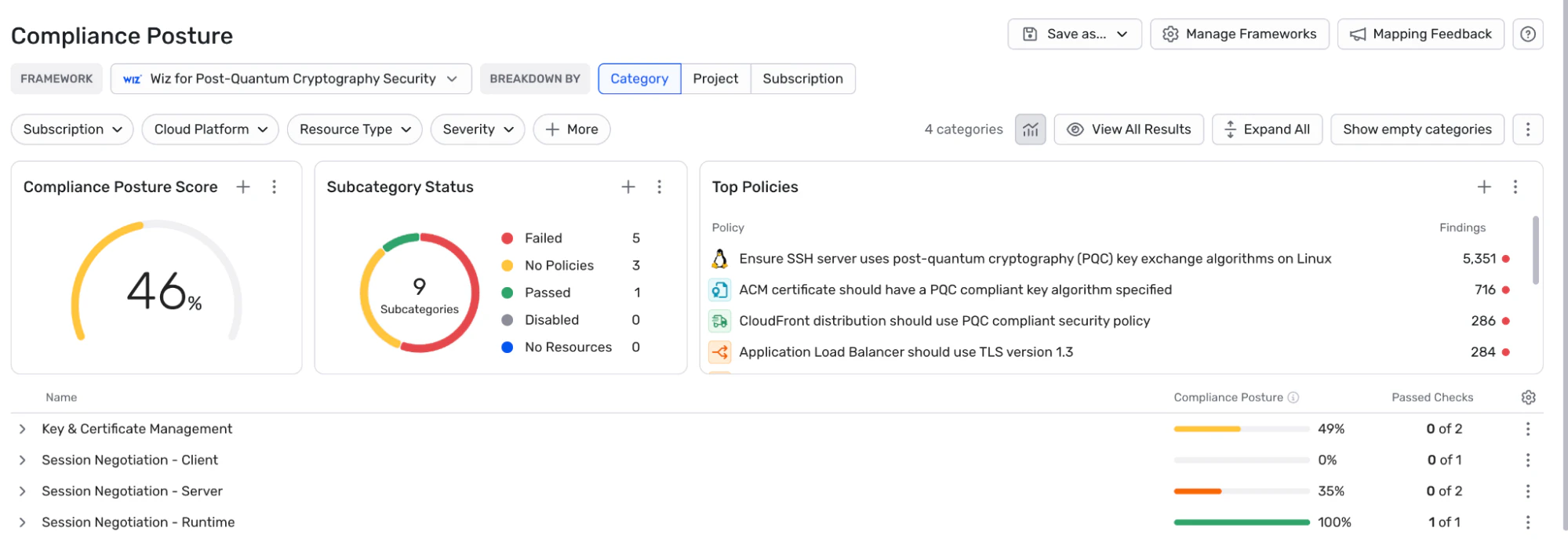 The European Union is targeting that critical infrastructure be transitioned to PQC by 2030, with full transition by 2035. What needs to be upgraded?Only asymmetric cryptography is being replaced (ex. RSA, ECDH, ECDSA, and EdDSA). Symmetric encryption and hashing are not as vulnerable. Quantum computers are more capable than traditional computers for attacking symmetric encryption (via something called Grover’s quantum algorithm), but according to the NIST FAQ on PQC, AES-128 is quantum resistant. For hashing, SHA-2 is recommended for PQC. Note that you may need to evaluate your specific use case as these statements are given by different organizations as general guidance.We believe migration plans should be broken into 3 parts:Inventory what needs to be migrated.Migrate TLS and SSH key exchange functionality.Migrate everything else. I’ll talk more about how to create an inventory in a moment, but let’s look at that second step. I believe this should be the initial focus after an inventory because it is not only urgent, but it is also easy! This step is urgent because it mitigates the Harvest Now, Decrypt Later risk for those systems, and it’s easy because it just involves upgrading software or setting a configuration. Upgrading things so that PQC is used in key exchanges is so easy that you might already be supporting it. We scanned the top 1 million domains (using Cloudflare’s list, which includes domains beyond those hosted on Cloudflare), and found that 84% of the accessible domains support TLS 1.3, which is needed for the PQC key exchanges. 45% of the total accessible domains support the PQC key exchanges.ExampleLet’s take a server with OpenSSH running as an example. Imagine you installed OpenSSH a few years ago and a dozen people created RSA key pairs for their authentication to it (let’s ignore that there are probably better ways of accomplishing whatever it is we set this up for). There are two important things you’ll want to do to upgrade this for PQC compliance. The first is to upgrade the OpenSSH server to the latest version so it uses PQC for the key exchange. The second is to regenerate new key pairs using a PQC compliant signature algorithm. The first step is a simple upgrade of the server and the clients (with no dependencies on ordering) and now all communication is protected against Harvest Now Decrypt Later risks. You do NOT need to generate new PQC key pairs in order to be protected against that risk. The RSA key pairs are used in the authentication, which happens after an encrypted session has already been set up that is protected with PQC. The authentication using the RSA key pairs is only at risk if an attacker obtains a CRQC before you start using new key pairs, so it is not as urgent. If you wait to upgrade OpenSSH though then the attacker might be collecting the traffic now and that traffic will be readable by the attacker once they have a CRQC.The second step of generating new key pairs is much more troublesome to do. The first problem you’ll run into is OpenSSH does not currently support a PQC algorithm for authentication, so you can’t perform this step even if you wanted to. But once OpenSSH does support ML-DSA, you’ll need to get everyone to generate and start using those new keys, and get rid of the old ones, which is messier. Migrating keys is more difficult than simply upgrading software. So this part of the migration falls in the “everything else” category. Although a lot of software has now added support for TLS and SSH key exchange functionality, very little other PQC support exists today.How to create an inventory for PQC migrationIn order to help Wiz customers create an inventory for PQC migration, we’ve created the “Wiz for Post-Quantum Cryptography Security Framework” where we have added detections for relevant encryption. This capability is sometimes referred to as an Automated Cryptography Discovery and Inventory (ACDI) tool with one form of output known as a Cryptographic Bill of Materials (CBOM).