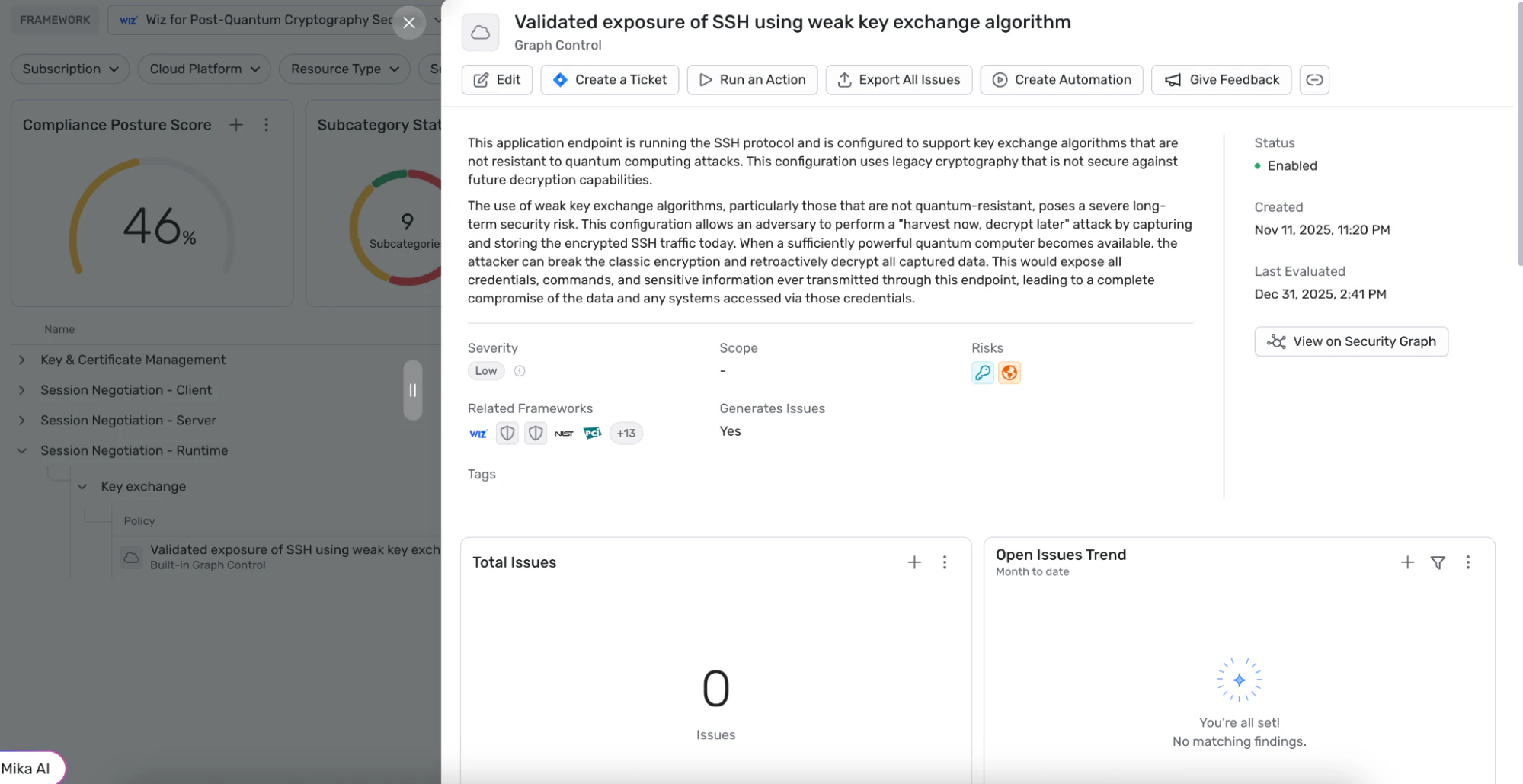 How Wiz Detects Your Cryptographic RisksTo eliminate blind spots in your active environment, Wiz leverages different scanning methods:Dynamic Scanning (External Network Scanning): Proactively scan public-facing services to identify active cryptographic protocols. Detection focuses on identifying weak SSH Key Exchange (KEX) methods.